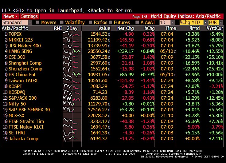 “Global markets start in Risk-Off mode to the week. Stocks fell along with Yuan & Treasury yields amid US-China trade war escalation. Investors awaited details on possible China counter-measures. US 10 year yields drop to 2.44%, Yen and bitcoin strengthen on haven bids.”