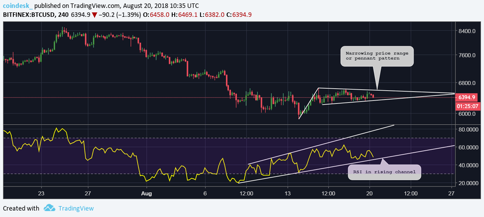 However, the bears could feel emboldened if the 4-hour candle closes below $6,320. In this case, BTC could drop below $6,000 (February low). It is worth noting that a downside break of the pennant would push the RSI below the rising channel support and that would only validate the bearish price pattern.