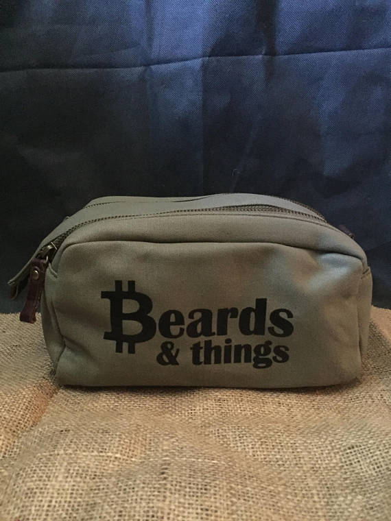 This canvas toiletry bag is perfect for any crypto currency lover going to the gym or taking a trip. This lined toiletry bag is olive green and contains two top zippers & a hook and loop patch to securely close it. This bag contains one large compartment and measures approx. 5"H x 9"W x 5"D.