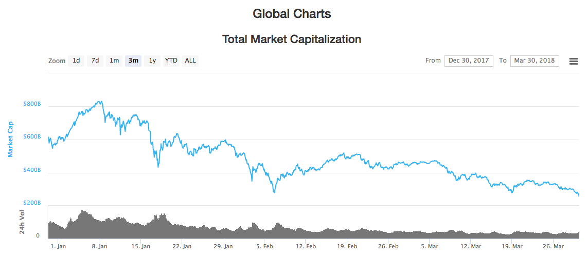 Data from CoinMarketCap the market capitalization of all cryptocurrencies is now at a three-month low of $256 billion, a 70 percent decline since its 2018 high above $800 billion in early January.