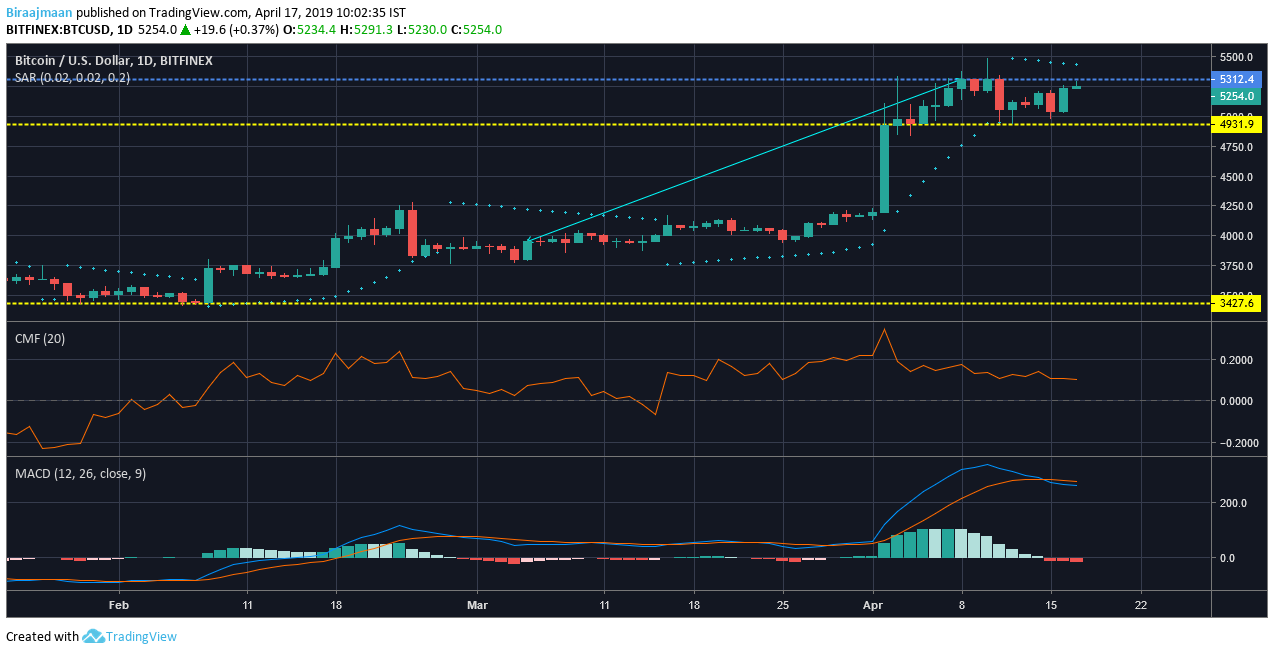 The one-day chart of bitcoin exhibited the uptrend due to the surge and pushed up the valuation from $3952.4 to $5310.3. The new support line scaled after the hike was placed at $4931.9 and the resistance remained at 5312.4. The price held a sideways movement between these two lines at press time.