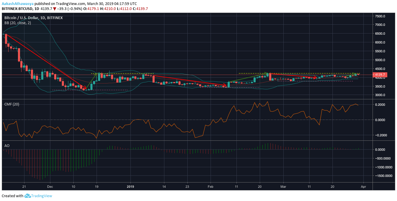 The one-day BTC chart shows the coin trading between $3,800 and $4,200 since the beginning of February. In this period, two notable trends were witnessed, the first pushed the price down from $4,215 to $3,984 and the second pushed the price from $4,030 to $4,213.
