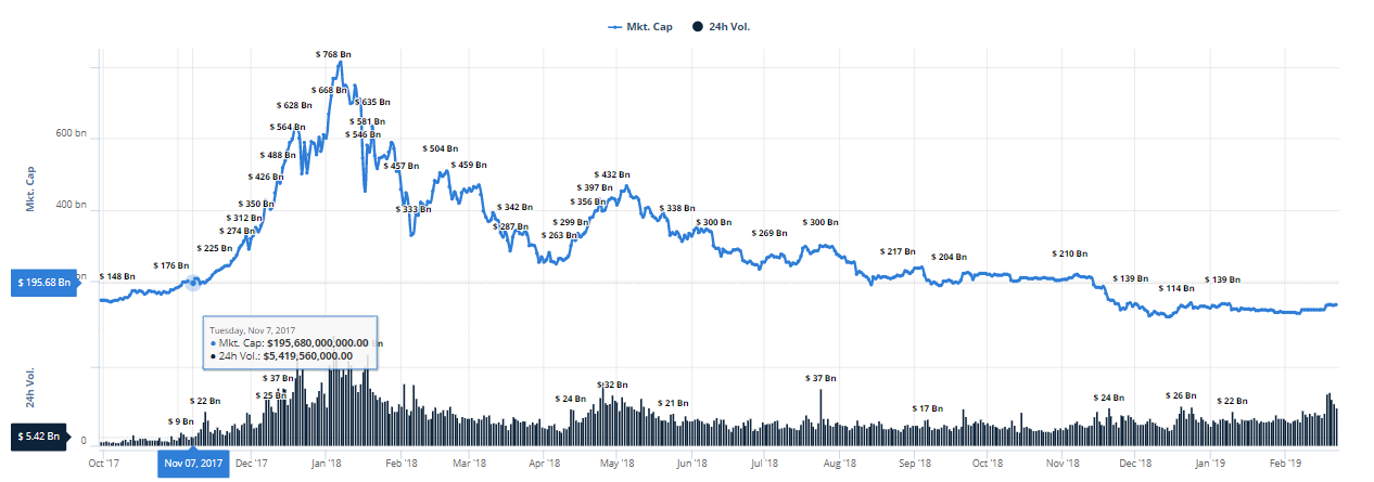 The last major peak was recorded on May 5, 2018, with a market cap of $466.72 billion and a 24-hour volume of $25.34 billion, after which the crypto-space has failed to recover.