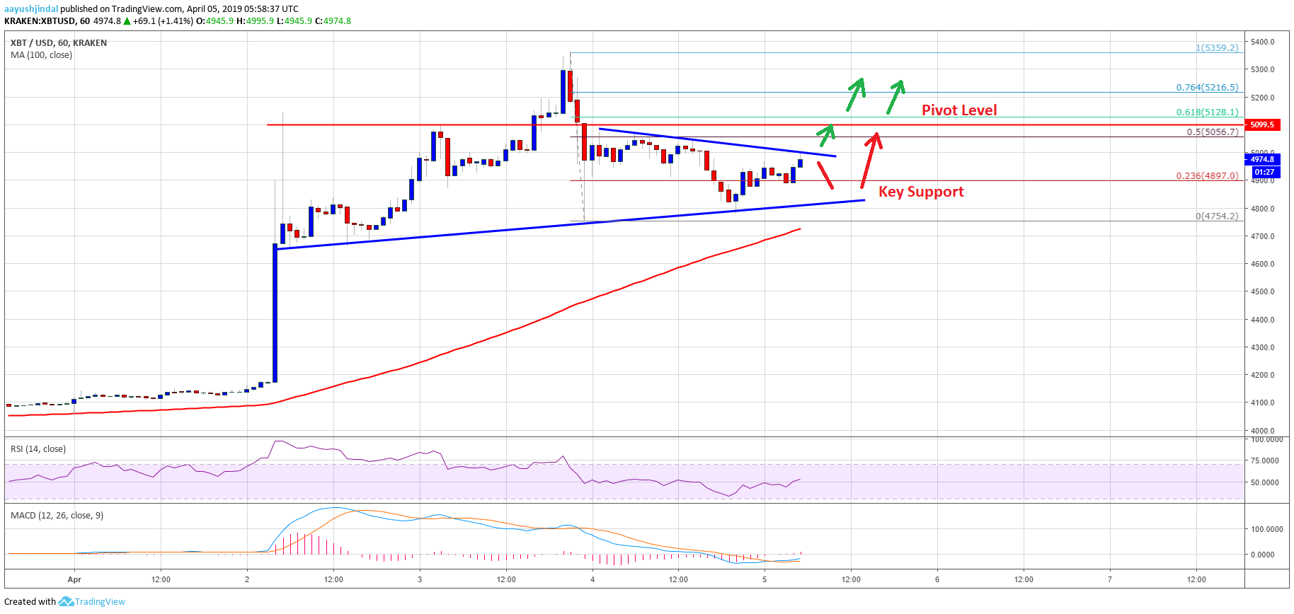 It broke the $4,850 level and the 23.6% Fib retracement level of the recent decline from the $5,359 high to $4,754 low. However, the price struggled to break the $5,050 resistance level. At the outset, there is a crucial contracting triangle in place with support near $4,800 on the hourly chart of the BTC/USD pair. Above the triangle, there is a strong resistance near the $5,050 level. The 50% Fib retracement level of the recent decline from the $5,359 high to $4,754 low is also at $5,056.