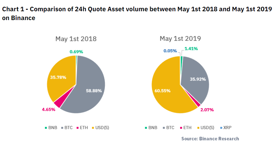 Quote asset volumes driven by stablecoins such as PAX, TUSD and USDC on Binance (denoted as USD(S)) recorded a 69% increase in the market share. Interestingly, the share of volume in BNB pairs also doubled during the same time period, making a jump from 0.69% to 1.41%. As a result, BTC pairs have lost almost 40% of its market share. The report attributed this change to the “introduction of several stablecoin pairs with new quote assets and base assets.”