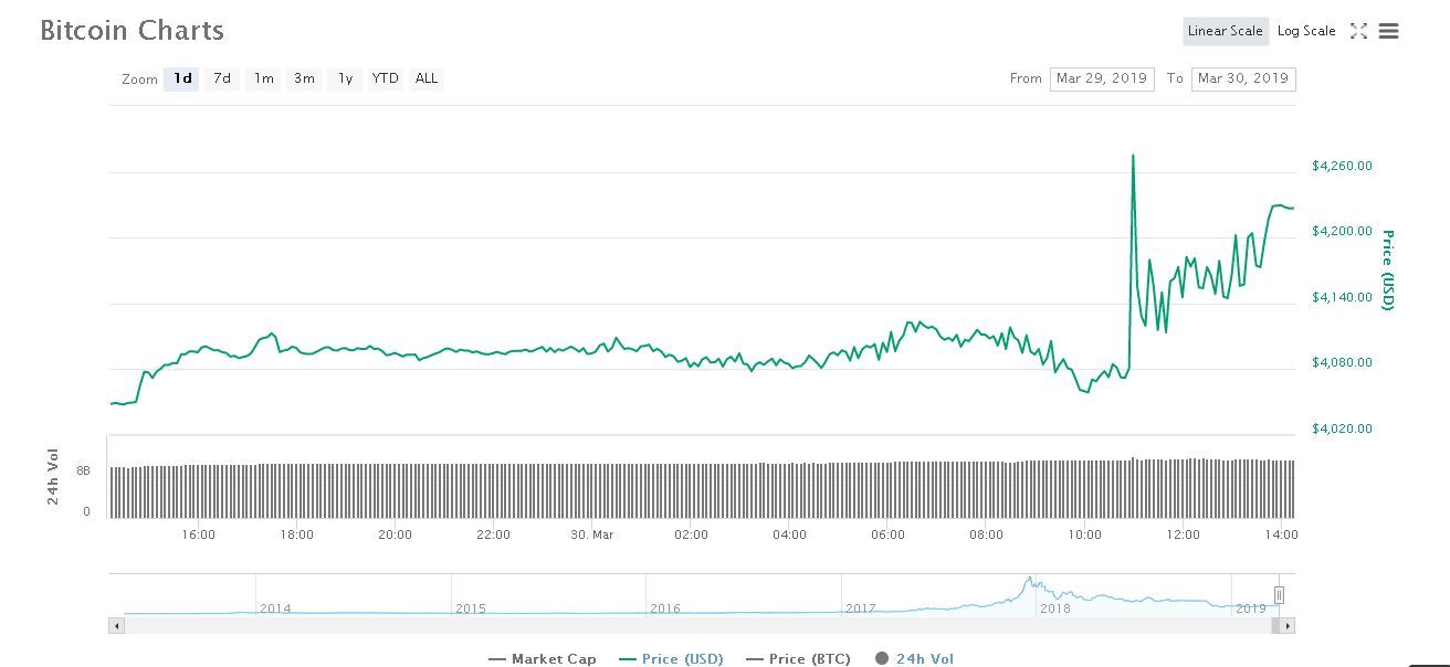 bitcoin [BTC], the largest cryptocurrency in the world, was surging over the past few hours, at press time. This pump in price helped BTC cross strong resistance at the $4,200-mark, pushing the king coin’s value to $4,228.05. The price surged as high as $4,275.14, before falling to the $4,100 level.