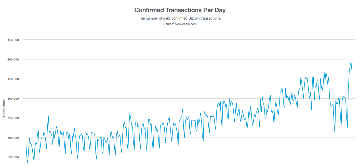 bitcoin [BTC] has seen a massive spike in its network capacity despite the ongoing crypto-winter, leading to a decline in the coin’s price over the past few months. The latest research from Blockchain.info indicates that on-chain confirmed transactions have shot up to 400,000 in the past day.