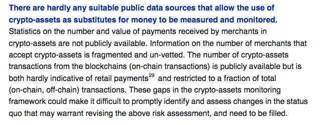 “The high volatility of crypto-assets, absence of central bank backing and the limited acceptance among merchants prevent crypto-assets from being currently used as substitutes for cash and deposits, as well as making it very difficult for crypto-assets to fulfil the characteristics of a monetary asset in the near future”