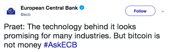 This very principled debate about the nature of cryptocurrency was highlighted by Peter Praet, the executive board member and the chief economist at the Central Bank of the Union, who said,