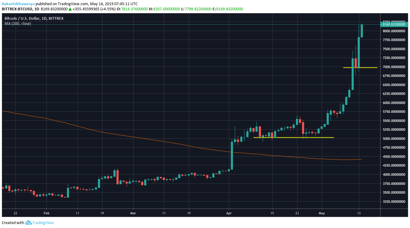 bitcoin broke its 200-day moving average on 2 April, owing to the first inkling of the bull-run. The rise above $5,000 was the cryptocurrency’s highest daily gain since April 2018. Since then, the coin has been consistently trading above the same and it currently stands at 84 percent over its 200MA.