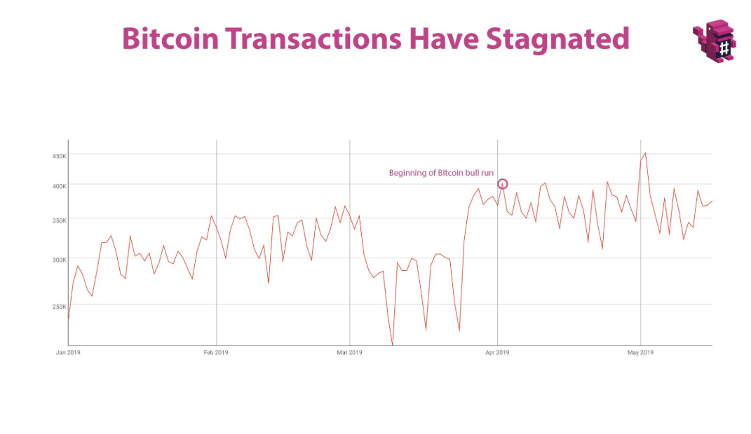 With the bitcoin pullback, caused by a host of factors, market correction, the close of Consensus 2019 and even a large sell order on Japanese crypto-exchange Bitstamp, the number of transactions dropped from 390,000 to 360,000 on May 17. However, the lowest transaction for this month was at 322,000, recorded on May 10.