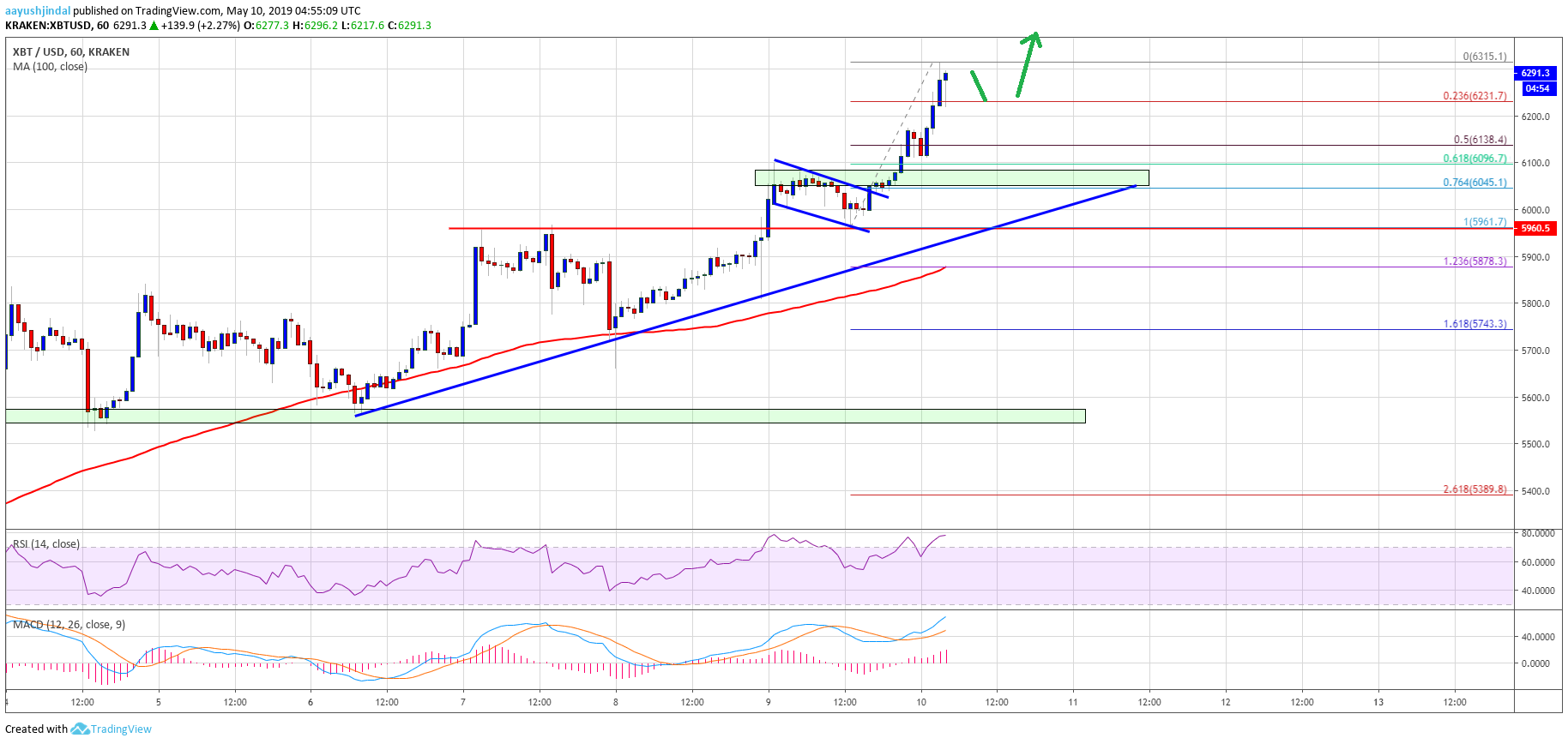 This week, bitcoin price and rallied above $6,000 and $6,200 against the US Dollar. The BTC/USD pair gained bullish momentum after it settled above $6,100 and the 100 hourly simple moving average. Recently, it broke a bullish flag pattern with resistance near $6,040 on the hourly chart to start a strong upward move. As a result, the bulls pushed the price above the $6,250 and $6,300 resistance levels. A new 2019 high was formed at $6,315 and the price is likely to extend gains.