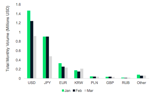 Although USD holds over 46 percent of all BTC trading into fiat for February and March, all signs are not positive. The BTC to USD volume was in continuous decline, dropping from over 1.4 million BTC in January to under 1.24 million BTC in February. Further, March saw a significant 26.2 percent decline to 0.92 million BTC.