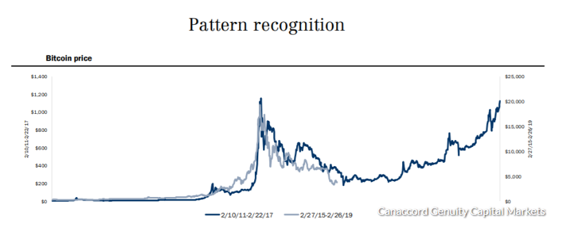 In a research note, the two crypto-analysts, Michael Graham, and Scott Suh drafted a chart where an identical resemblance was observed between the periods 2011-2015 and 2015-2019.