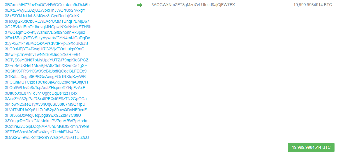 The recipient wallet, “3ACGWkNmZFT8gMzo7vLUtocd8ajCjFW7FX” now has a total of 19,999.9984514 BTC in its custody. The transaction took place on February 13, 2019, at 15:15:56 and the image below shows the wallets that transferred those BTC,