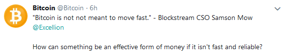Samson Mow’s comment was quickly picked up by @bitcoin, an account controlled by BCH proponent Roger Ver. The account responded,