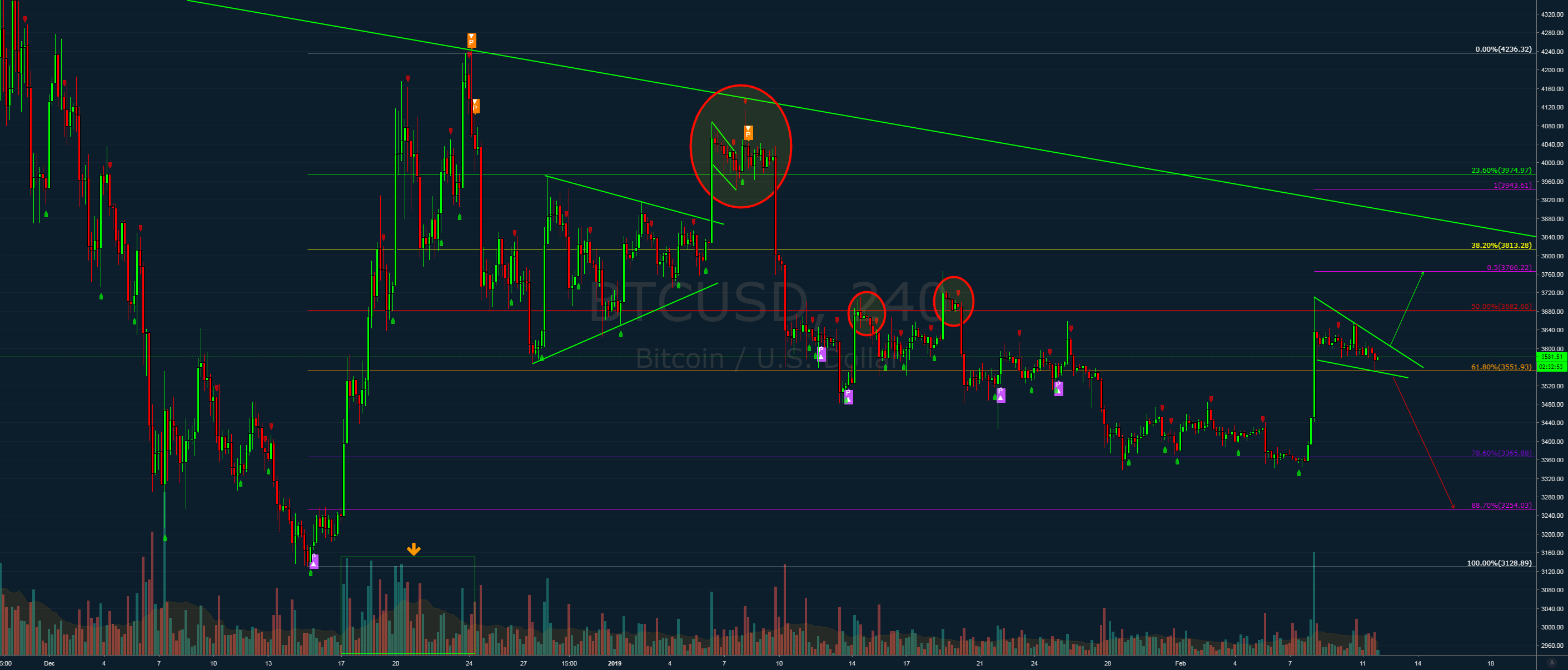 Third, let’s look at the time between one impulse and the next. We’ve been slowly bleeding with the exception of that one green 4H candle that was followed up with a big red candle… with even more . That would be the rejection at about $3650 that I’m referring to.