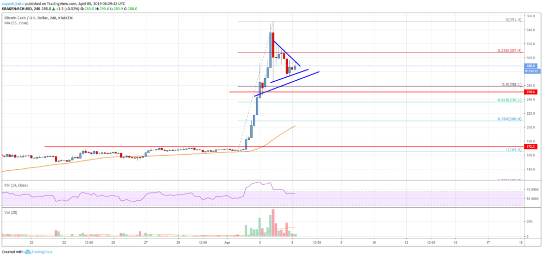 This week, there was a strong increase in , , , and bitcoin cash against the US Dollar. Earlier, the BCH/USD pair formed a support base above the $140 and $150 levels. It traded in a range below the $170 level for a few sessions. Finally, buyers got into action and pushed the price above the $170 and $200 resistance levels. It resulted in a sharp upward move above the $250 and $300 resistance levels. The recent trend was such that the price even climbed above $325 and settled well above the 55 simple moving average (4-hours).