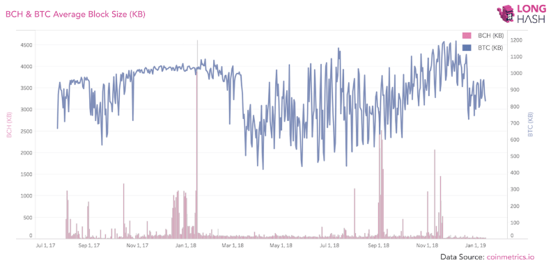 “There has only been one day so far where BCH blocks have been more than half full. On January 15, 2018, one year ago today, BCH blocks averaged 59% of their total capacity.”