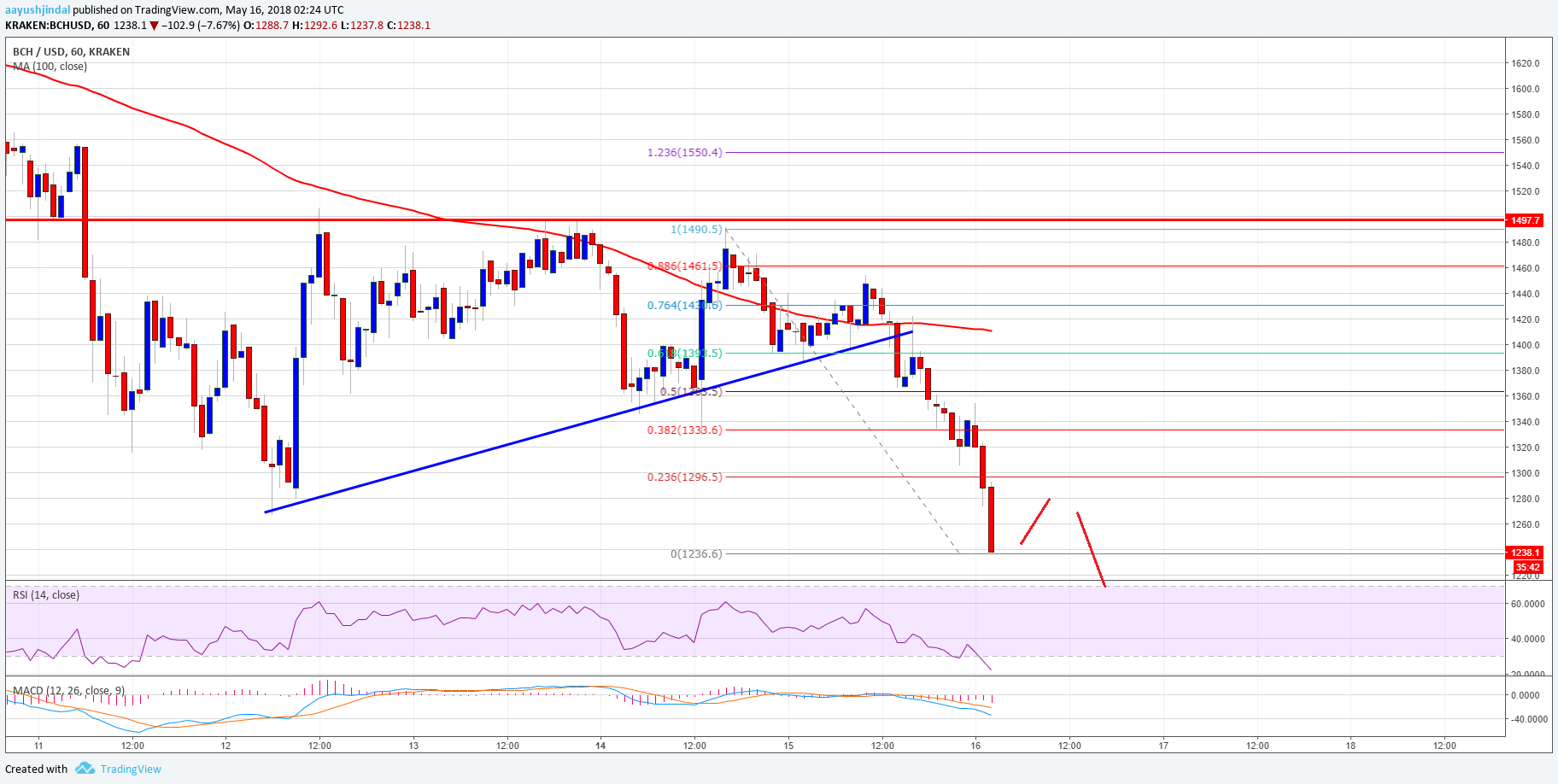 It opened the doors for more losses and there was a break below a key connecting bullish trend line with support at $1,410 on the hourly chart of the BCH/USD pair. The pair even settled below the $1,300 support and the 100 hourly simple moving average. These are below $1,300 and it seems like the price may continue to trade lower in the short term. It is currently trading near the $1,240 level with a lot of selling pressure. If it corrects higher it could test the 23.6% Fib retracement level of the last drop from the $1,495 high to $1,240 low.