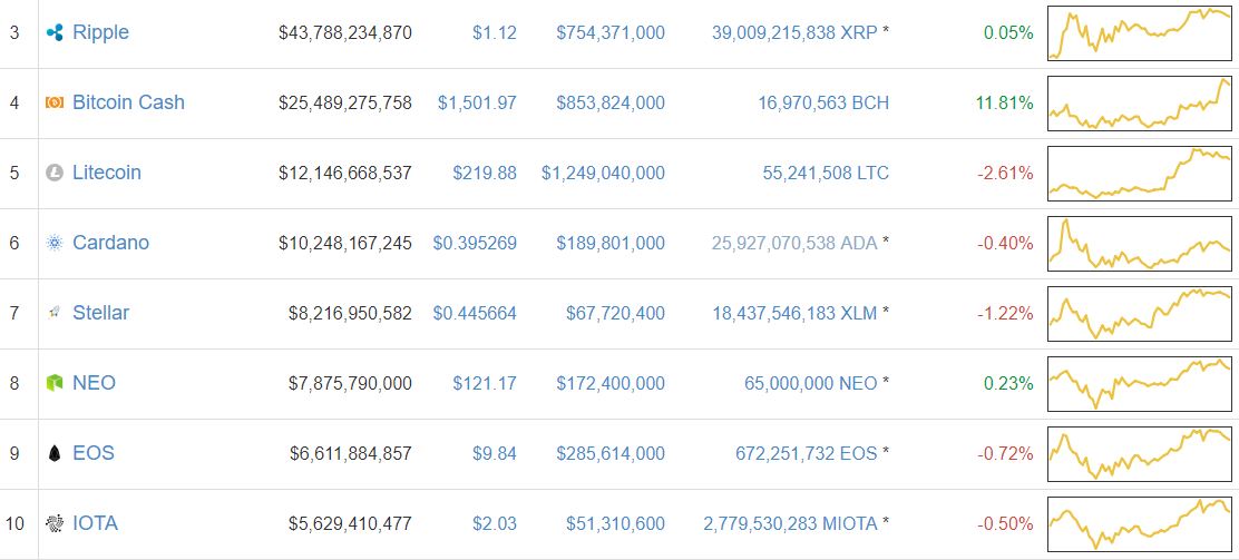 This advance enabled bitcoin Cash to gain significant ground on third-ranked Ripple, which remains valued at $43.8 billion after a day of sideways trading. Cardano, NEO, EOS, and IOTA posted similarly-stagnant returns, while Litecoin and Stellar declined by three percent and one percent, respectively.