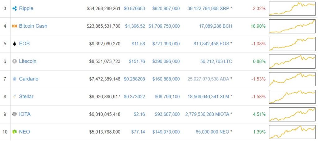 It’s unclear precisely what is fueling bitcoin Cash’s impressive rally, but it has brought the fourth-largest cryptocurrency within $10.4 billion of third-ranked Ripple, whose price declined two percent for the day and is currently valued at $0.87.