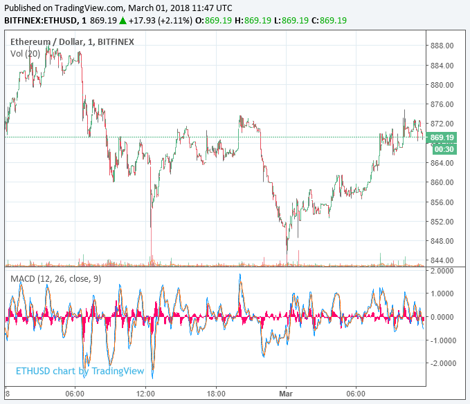 The experienced a moderate hiccup last night, briefly sinking below $850 before recovering to a present value of $869. This leaves the second-largest cryptocurrency’s market cap at $85.5 billion, a single-day increase of about one-half-of-one percent.