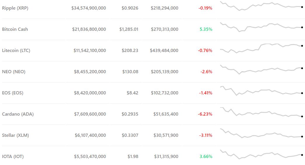 The bitcoin Cash price, meanwhile, led the index with a five percent advance to $1,285. bitcoin Cash currently has a $21.8 billion market cap, leaving it approximately $13 billion behind Ripple on the charts.