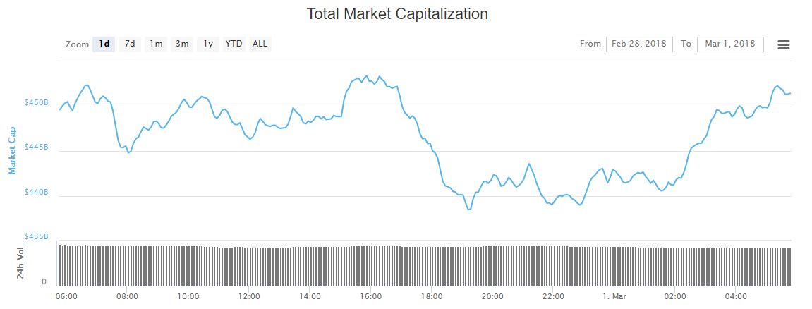 The had entered the day at $449.6 billion — the product of yet another midweek slump — and declined further heading into Wednesday evening. After bottoming out below $440 billion, the index experienced a moderate recovery on Thursday morning. At present, the market is valued at just below $453 billion, representing a 24-hour increase of increase of about three-quarters-of-one percent.