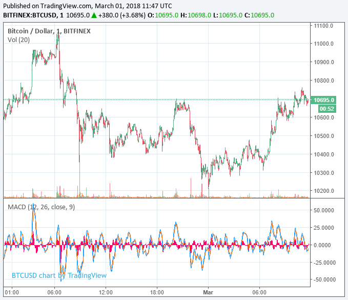 The managed to achieve a one percent increase for the day, placing it at a present value of $10,695 on cryptocurrency exchange Bitfinex. The flagship cryptocurrency now has a $181.4 billion market cap, which translates into a 40 percent share of the total cryptocurrency market cap.