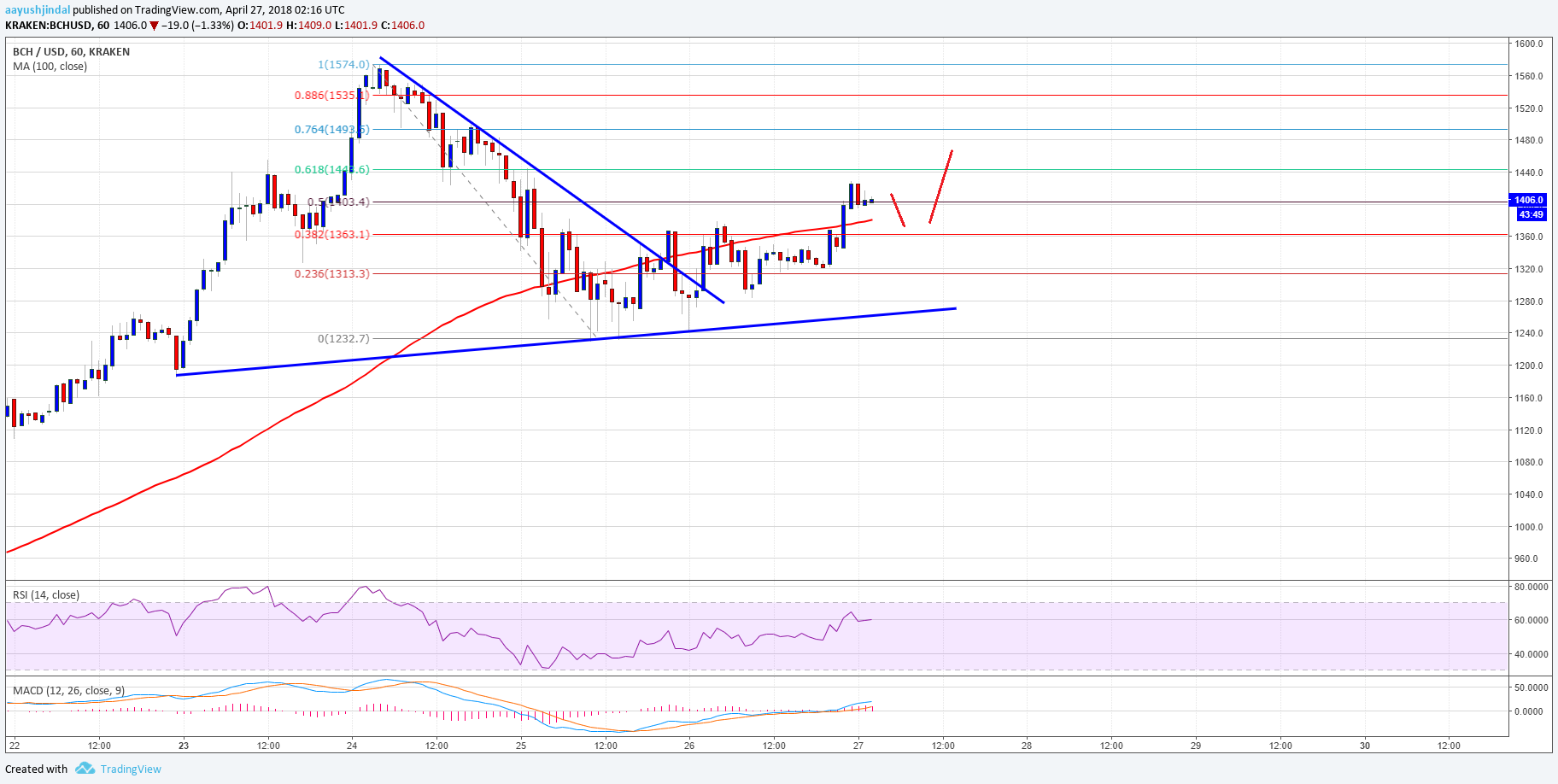 More importantly, there was a break above a connecting bearish trend line with resistance at $1,320 on the hourly chart of the BCH/USD pair. It opened the doors for more gains and the price moved above $1,350 and the 100 hourly simple moving average. At the moment, the pair is trading near the 50% Fib retracement level of the last decline from the $1,575 swing high to $1,232 low. It seems like the price is forming a base for another above $1,450. The current technical structure is positive above $1,350 and the 100 hourly SMA, suggesting an upward move.