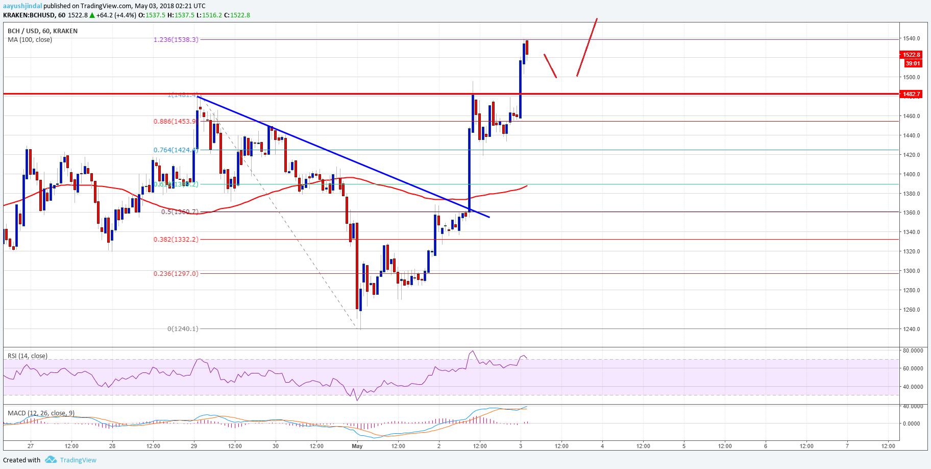 bitcoin cash price is rising sharply above $1,500 against the US Dollar. BCH/USD has to move past $1,540 to continue its upside momentum.