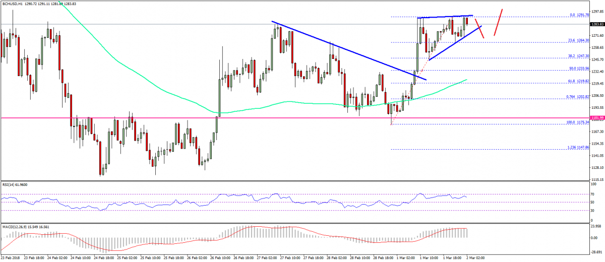 There was a initiated from the $1,175 swing low in bitcoin cash price against the US Dollar. The price traded higher and it was able to break two important resistance levels – $1,200 and $1,220. More importantly, there was an hourly close above the $1,200 level and the 100 hourly simple moving average. It opened the doors for more gains above $1,250.