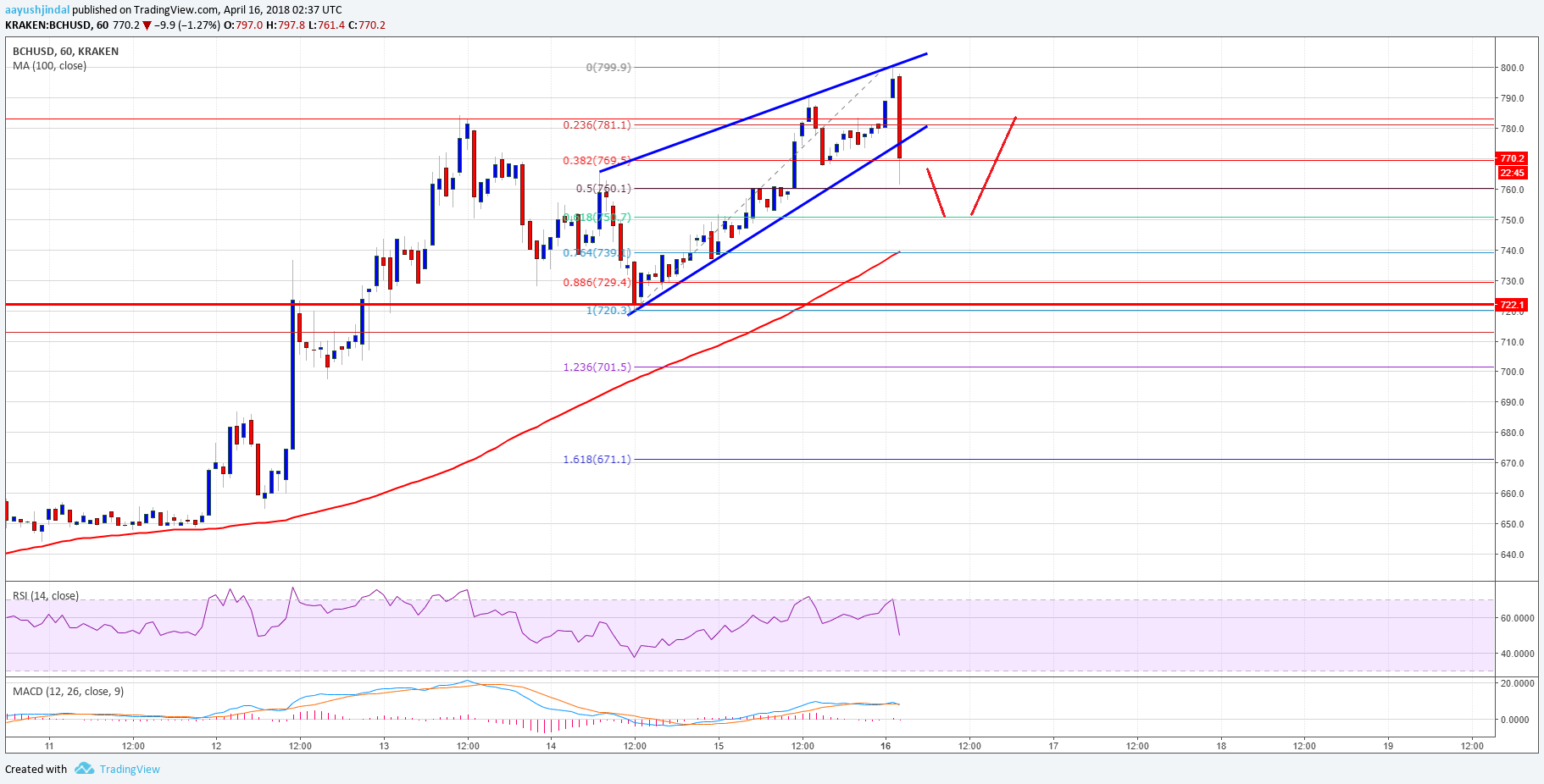 There was a decent in bitcoin cash price above the $780 level against the US Dollar. The price surpassed the last swing high and tested the $800 resistance area. However, the price failed to surpass the mentioned $800 resistance, and there was a slight bearish reaction. A short-term top was formed near the $799.9 level before the price started a downside correction.