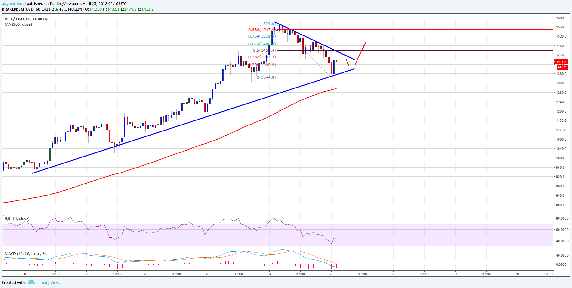 On the downside, there is a crucial bullish trend line in place with support near $1,360 on the hourly chart of the BCH/USD pair. Below the trend line support and $1,350, the next major support is around the 100 hourly simple moving average at $1,300. Therefore, there are two crucial supports for the current trend – $1,350 and $1,300. As long as the price is above the , it could bounce back towards $1,500. At the moment, the price is recovering and testing the 38.2% Fib retracement level of the last decline from the $1,574 high to $1,344 low.