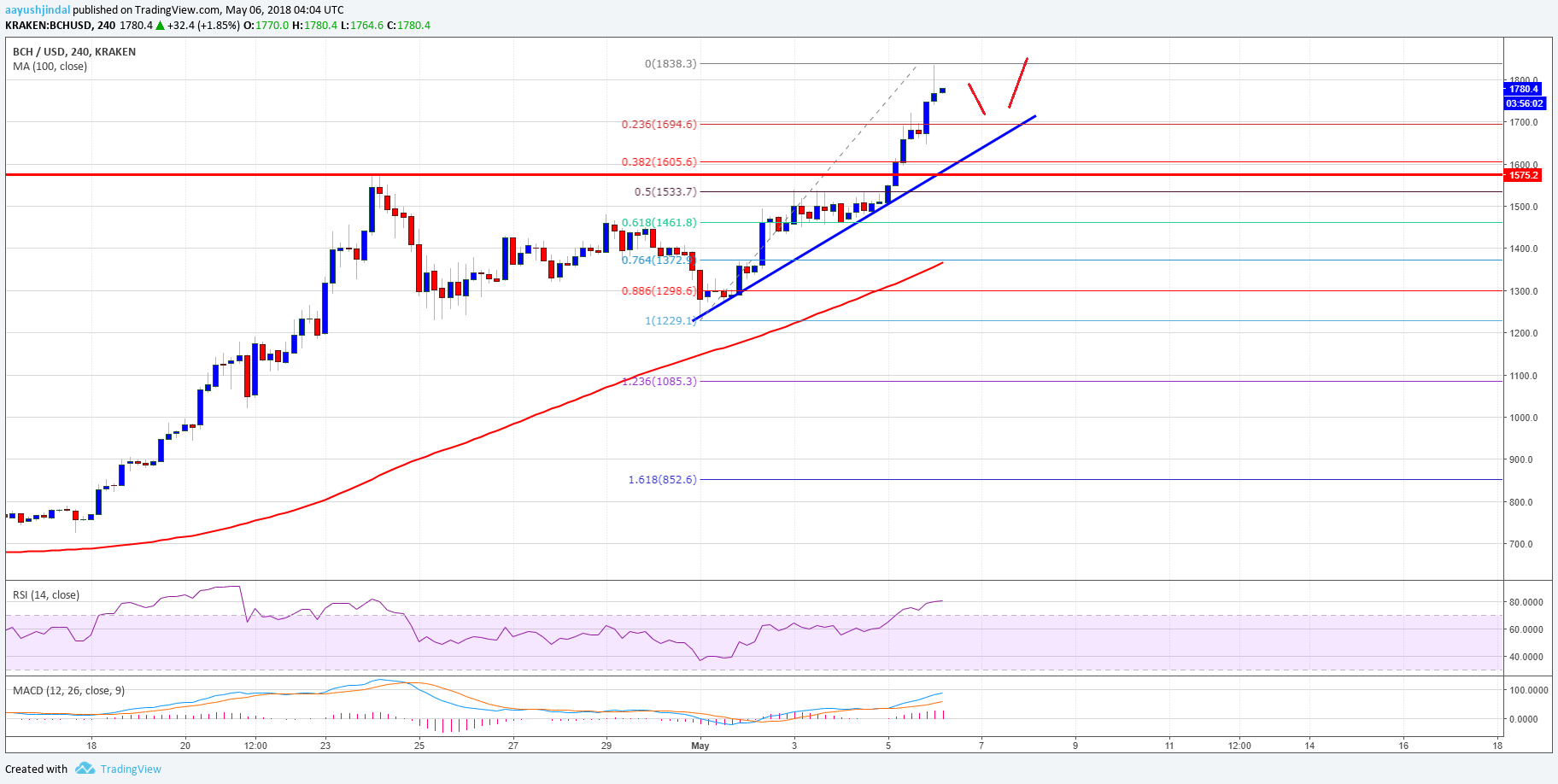 There were in bitcoin cash price from the $1,450 swing low against the US Dollar. The price surged higher and broke many barriers such as $1,500, $1,550 and $1,700. It even cleared the $1,800 hurdle and traded as high as $1,838 recently. The current price action is super bullish and it seems like the price may perhaps continue to grind higher towards $1,900 in the near term.