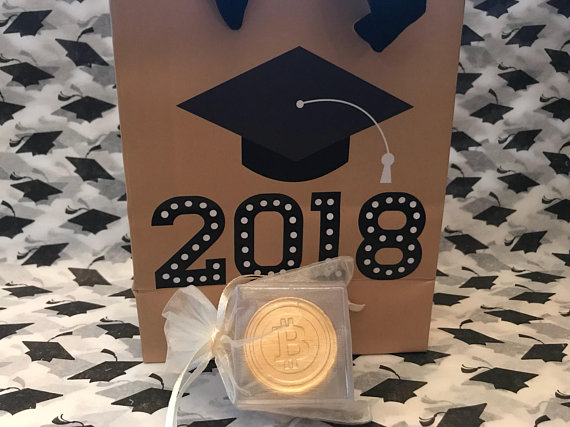 4 bitcoin chocolates in an acrylic box, tucked in a silk pouch, wrapped in graduation themed rice paper.