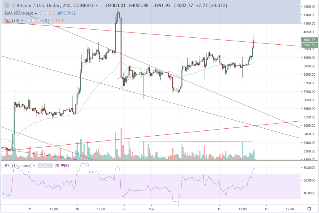 The BTC/USD exchange rate surged 3.30-percent in the past 24 hours to establish a session high towards 4069. Simultaneously, the rest of the cryptocurrency market also went green, with leading the bull pack with 17.81% gains, followed by Litecoin, EOS, and Ethereum that rose 8.44-, 5.47-, and 6.25-percent, respectively. On the whole, the cryptocurrency market capitalization added up to $6 billion worth of investments in a day.
