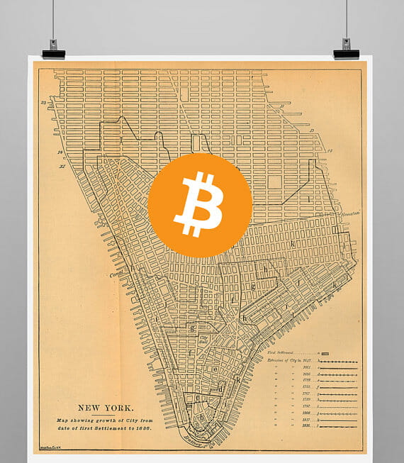 bitcoin cryptocurrency poster. The map is a restored vintage New York City map depicting the expansion of the city from 1642 until 1836.