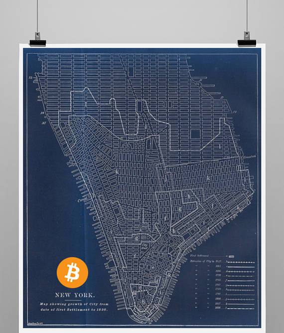 bitcoin cryptocurrency poster. The map is a restored vintage New York City map depicting the expansion of the city from 1642 until 1836.