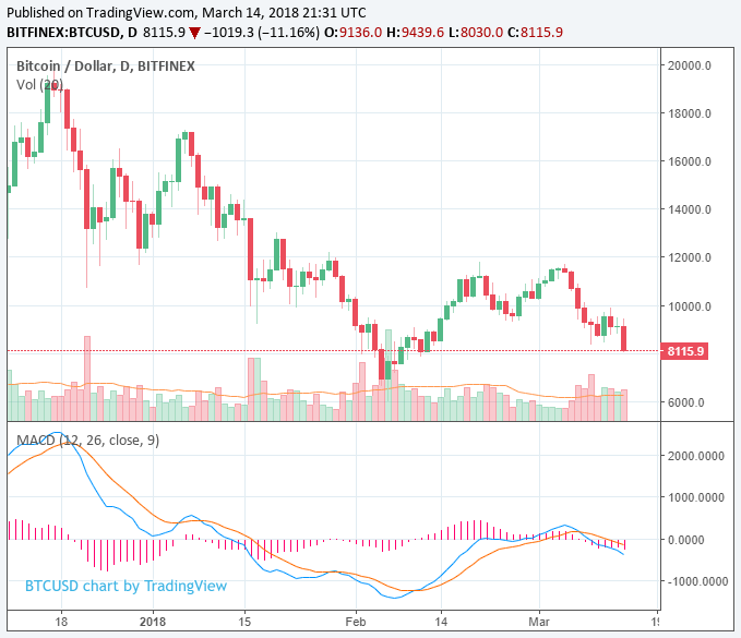 Today, on March 14, the price of bitcoin fell dangerously close to the $7,000 region, and given that it dipped below $8,030, it is possible that bitcoin could fall to the $7,000 mark in the short-term, which would be a steep decline from its weekly high at $11,400.