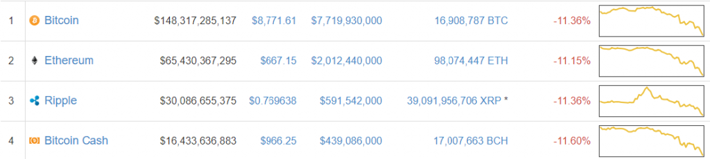 Since March 7, within a 48-hour span, the price of bitcoin decreased from $10,600 to $8,300, recording a staggering $2,300 drop in value. The entire market followed bitcoin’s price trend, as the three largest cryptocurrencies behind bitcoin in Ethereum, bitcoin Cash, and Ripple all declined by 11 percent, by the same exact margin as bitcoin.