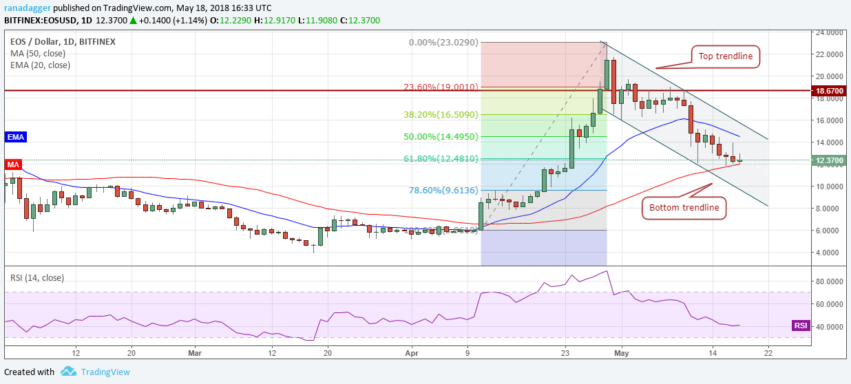 The next support on the downside is at $10 levels, while the overhead resistance is at $14. We shall look for buying opportunities once the digital currency sustains above the descending channel.
