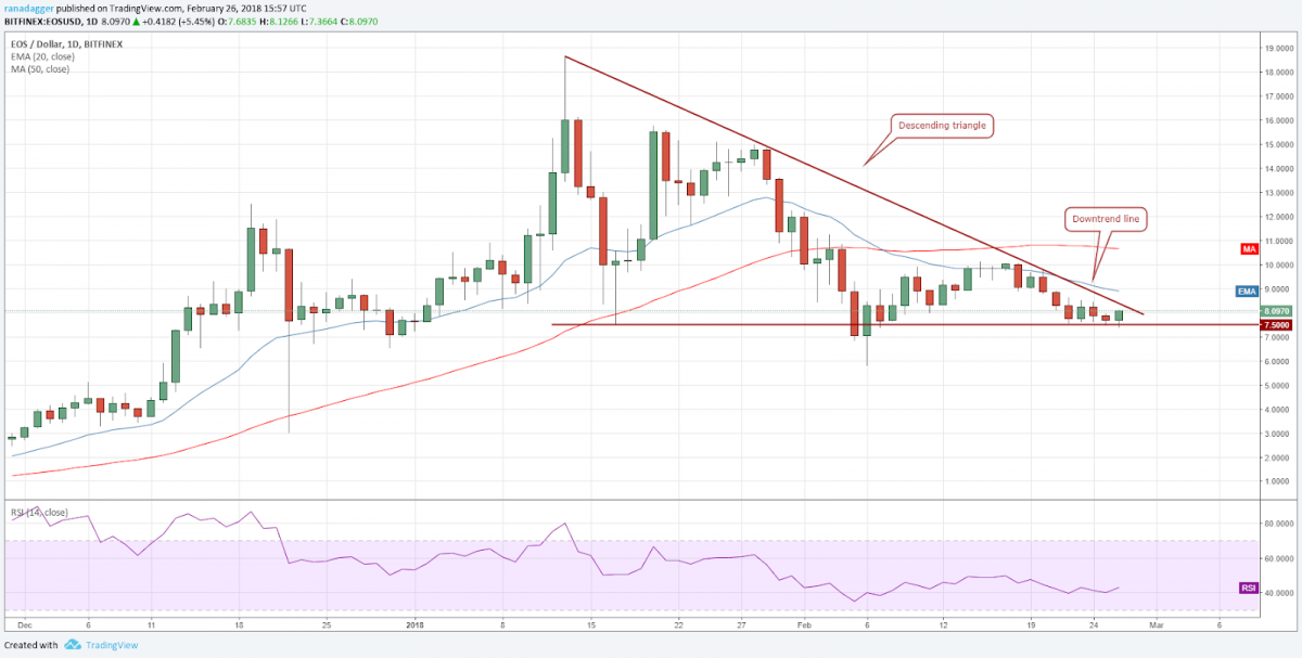 has held on to its critical support of $7.5 for the past five days. Though it had formed a bearish descending triangle pattern, it did not break down of it, and the price has reached the apex of the triangle. The pattern now stands invalidated.