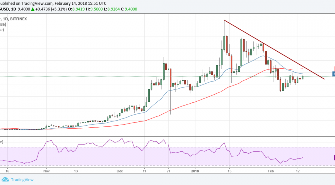 Since the large range move on February 8, has been trading in a small range. As most cryptocurrencies are showing signs of a recovery, we expect this consolidation to resolve on the upside.