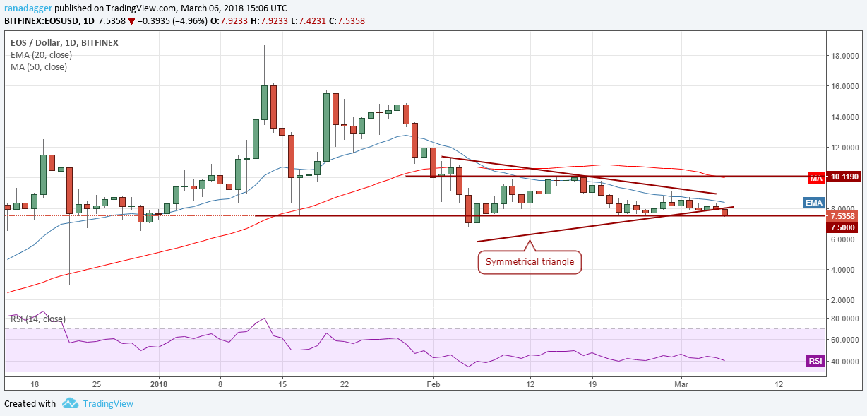 has broken down of the symmetrical triangle, which is a bearish development. Currently, the price is holding at the horizontal support of $7.5.