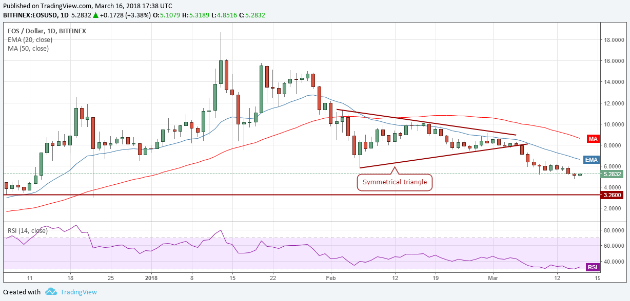 has been declining gradually for the past few days. It fell to a low of $4.7484 on March 15. We can expect the bulls to attempt a pullback from the current levels, but the 20-day EMA has been acting as strong resistance since end-January of this year. If prices turn down once again from there, a fall to $3.26 is likely.