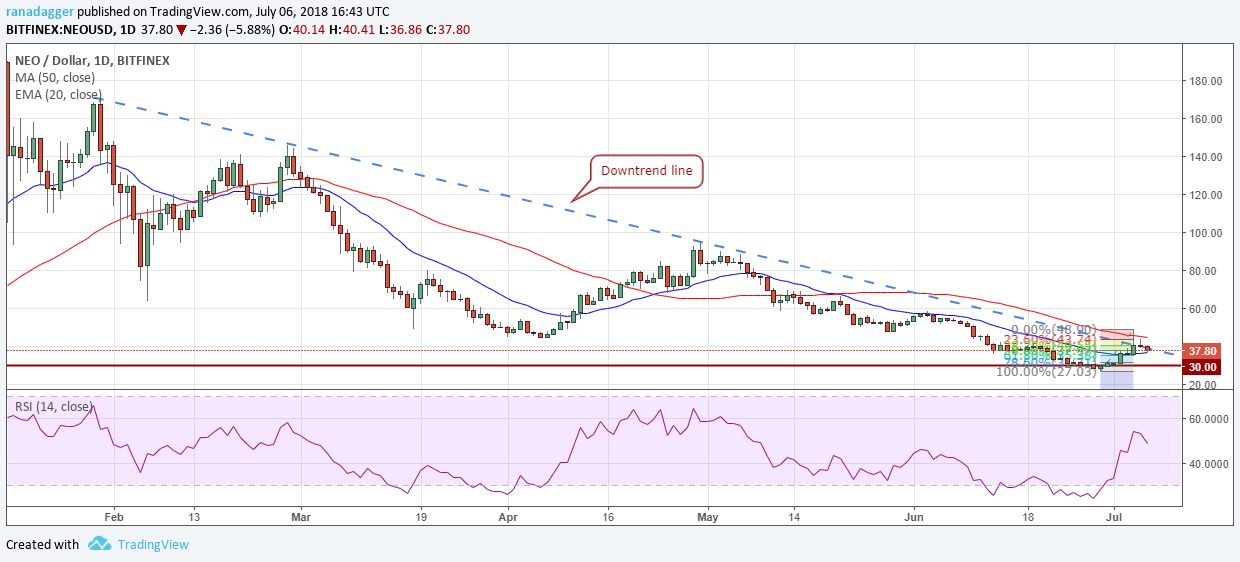is unable to bounce off the critical support level at $0.45. It failed to break out of the downtrend line for three days in a row.