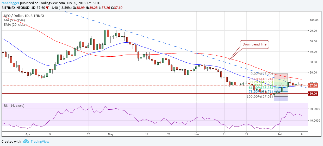 NEO dipped below the downtrend line on July 6 but found support at the 20-day EMA. The bulls are attempting to defend the support zone between $35.38-$37.97, the two being 61.8 percent and 50 percent retracement levels of the rally from the recent lows.