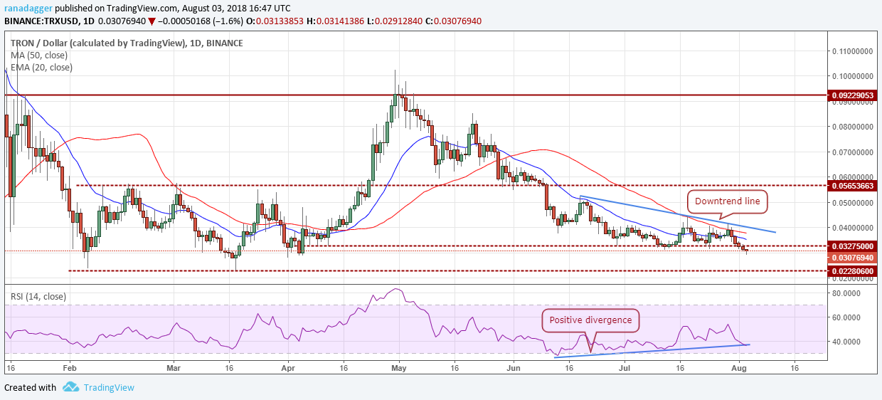 broke below the critical support at $0.03275 on July 1, after holding it for more than a month. It can now drift down to the next support at $0.028.